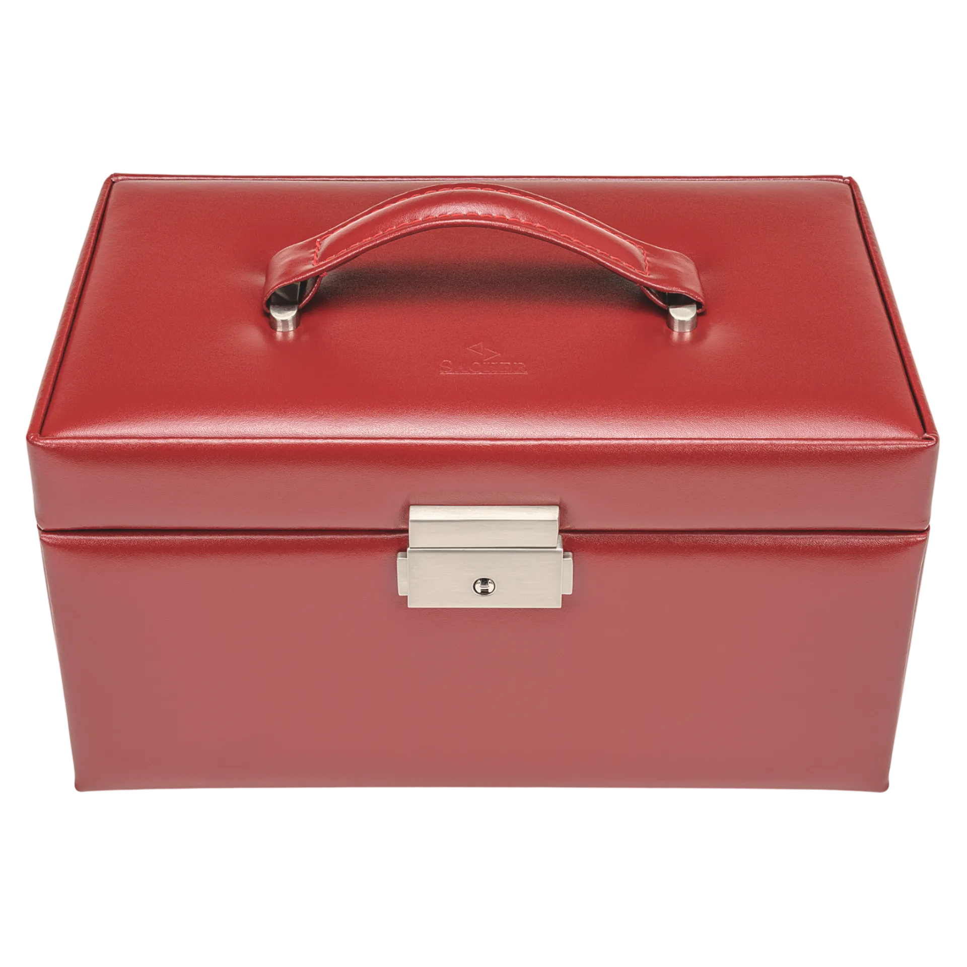 Unser luxuriöser Schmuckkoffer ist die ideale Lösung, um Ihre wertvollen Schmuckstücke sicher und stilvoll aufzubewahren. Dieser exquisit gestaltete Schmuckkoffer vereint Ästhetik und Funktionalität auf perfekte Weise, um Ihre Schmucksammlung zu schützen und gleichzeitig einfachen Zugang zu Ihren Lieblingsstücken zu bieten.- mit einem großen Ringpolster- 2 geräumige Schubfächer, davon 1 unterteilt- 12 kleine Fächer (ca. 35 x 35 mm)- abschließbares Schloss- großer Spiegel- mit elegantem, robustem Tragegriff- 100% handmade in Germany