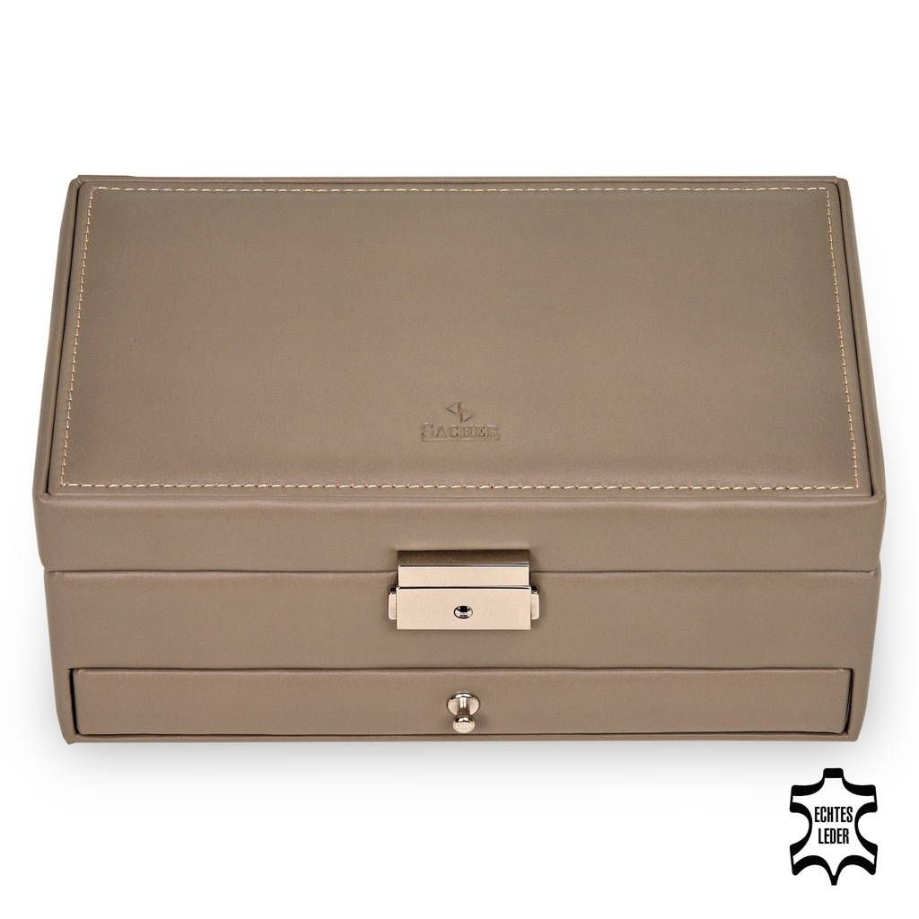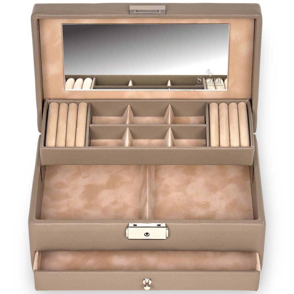 Unser luxuriöser Schmuckkoffer ist die ideale Lösung, um Ihre wertvollen Schmuckstücke sicher und stilvoll aufzubewahren. Dieser exquisit gestaltete Schmuckkoffer vereint Ästhetik und Funktionalität auf perfekte Weise, um Ihre Schmucksammlung zu schützen und gleichzeitig einfachen Zugang zu Ihren Lieblingsstücken zu bieten.- mit 2 Ringpolstern- geräumiges Schubfach- abschließbares Schloss- großer Spiegel im Deckel- 6 kleine Fächer im Automatikfach- 100% handmade in Germany