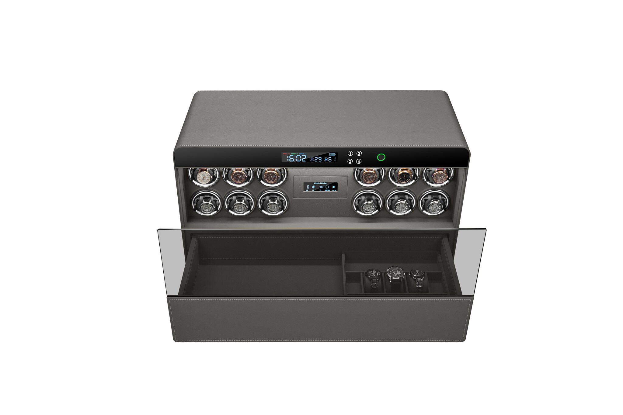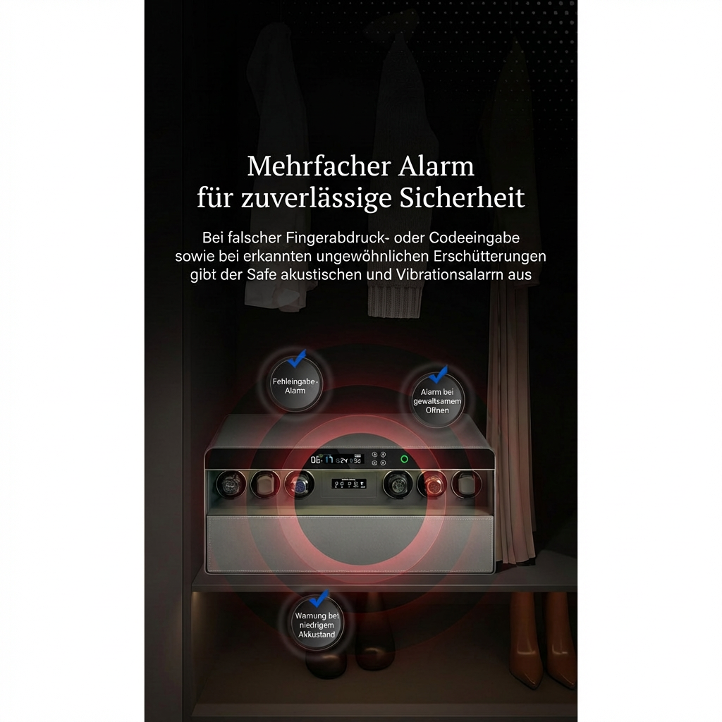 • Ihre Sammlung ist mehr als eine Auswahl an Zeitmessern – sie ist Ausdruck Ihrer Leidenschaft und Ihres Erfolgs. Unser intelligentes Safesystem bietet Ihren Automatikuhren den Schutz, den sie verdienen, und die Pflege, die sie brauchen.