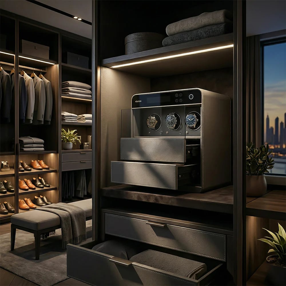 Ihre Sammlung ist mehr als eine Auswahl an Zeitmessern – sie ist Ausdruck Ihrer Leidenschaft und Ihres Erfolgs. Unser intelligentes Chronoguard Atrium Inteligent System bietet Ihren Automatikuhren den Schutz, den sie verdienen, und die Pflege, die sie brauchen. Während modernste Panzerung Ihre Werte sichert, simuliert die flüsterleise Präzisionsmechanik die Dynamik des Tragens. Gesteuert per App, vollendet in Handarbeit. Geben Sie Ihrer Zeit ein Zuhause, das ebenso beständig ist wie sie selbst.