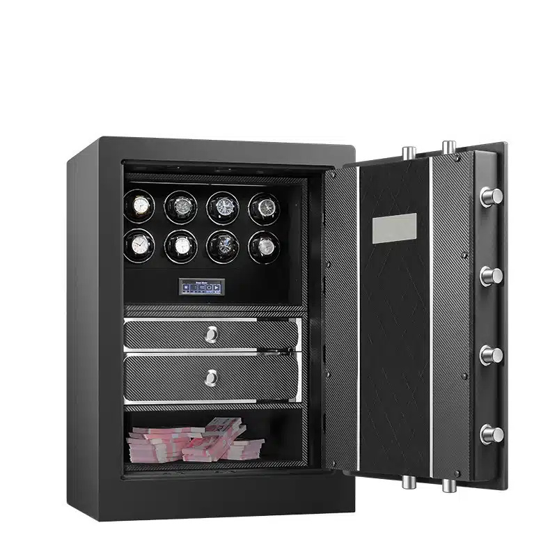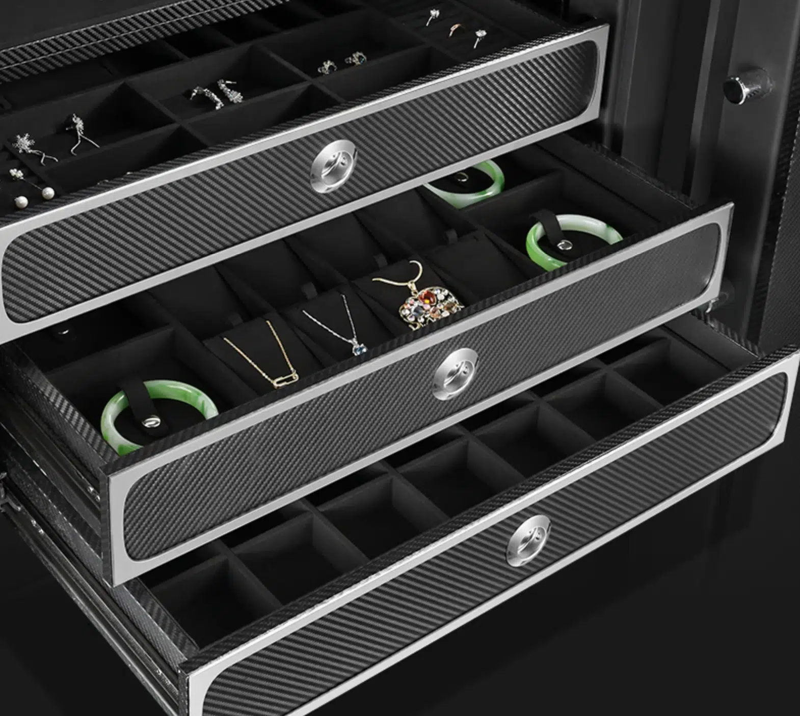 ⁃ Wählen Sie aus verschiedenen Materialien, die zu Ihrem gewünschten Look und Ihrer Funktionalität passen. Wir bieten beliebte Innenraumfarben und -designs an, und für weitere Anpassungen können Sie Materialien wie Kohlefaser, MDF mit Klavierlackierung, PU-Leder oder Pflanzenleder in Ihrer bevorzugten Farbe wählen. Für weitere Informationen oder Anfragen zur Anpassung zögern Sie bitte nicht, uns zu kontaktieren. Wir setzen uns dafür ein, Ihnen dabei zu helfen, den idealen Uhrensafe auf Ihre Vorlieben zugeschnitten zu gestalten.
