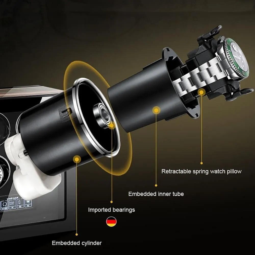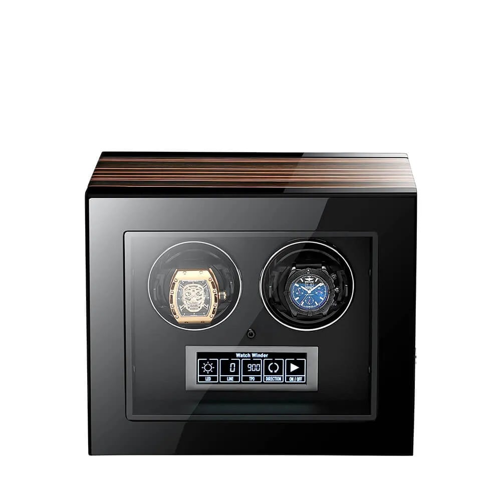 Hochwertiger Luxus Automatik 2 Uhrenbeweger mit Touchscreen. Lackiertes Klavierfurnier in Ebenholzausführung. Einer der feinsten Dual-Uhrenbeweger mit Touchscreen und neuer, nahezu geräuschloser, bürstenloser, langlebiger deutscher Motortechnologie.