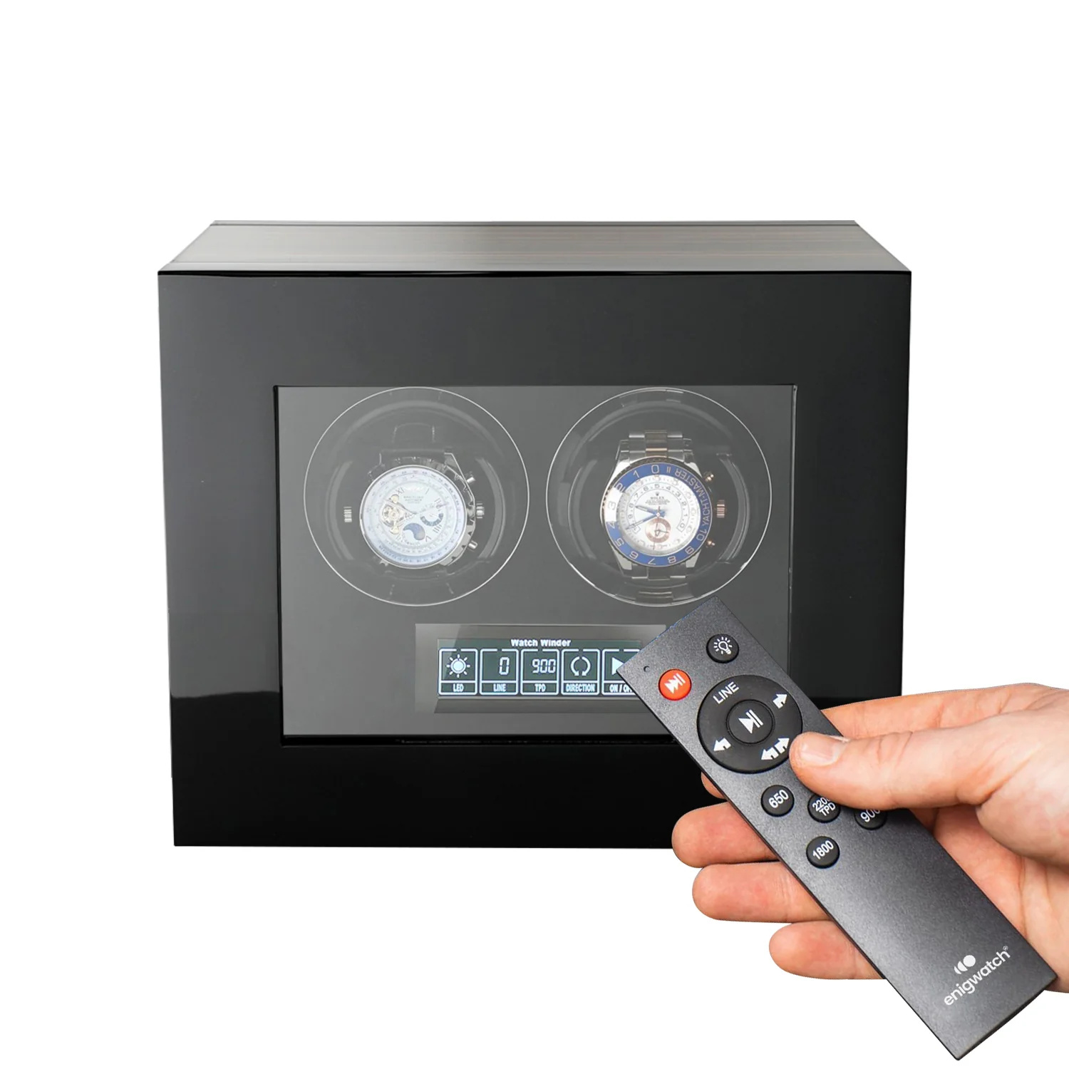 Der Touchscreen ist wunderschön gestaltet und ermöglicht eine einfache, aber genaue Einstellung. Fernbedienung. Wunderbarer neuer Uhrenhalter für alle Handgelenksgrößen und Uhrenköpfe mit einer Breite von bis zu 63 mm. Die Tür wird mit einem hochwertigen Schrankverschluss geschlossen gehalten und kann auch mit dem mitgelieferten Schlüssel verriegelt werden. Garantiert aufzuziehen: Alle Automatikuhren.