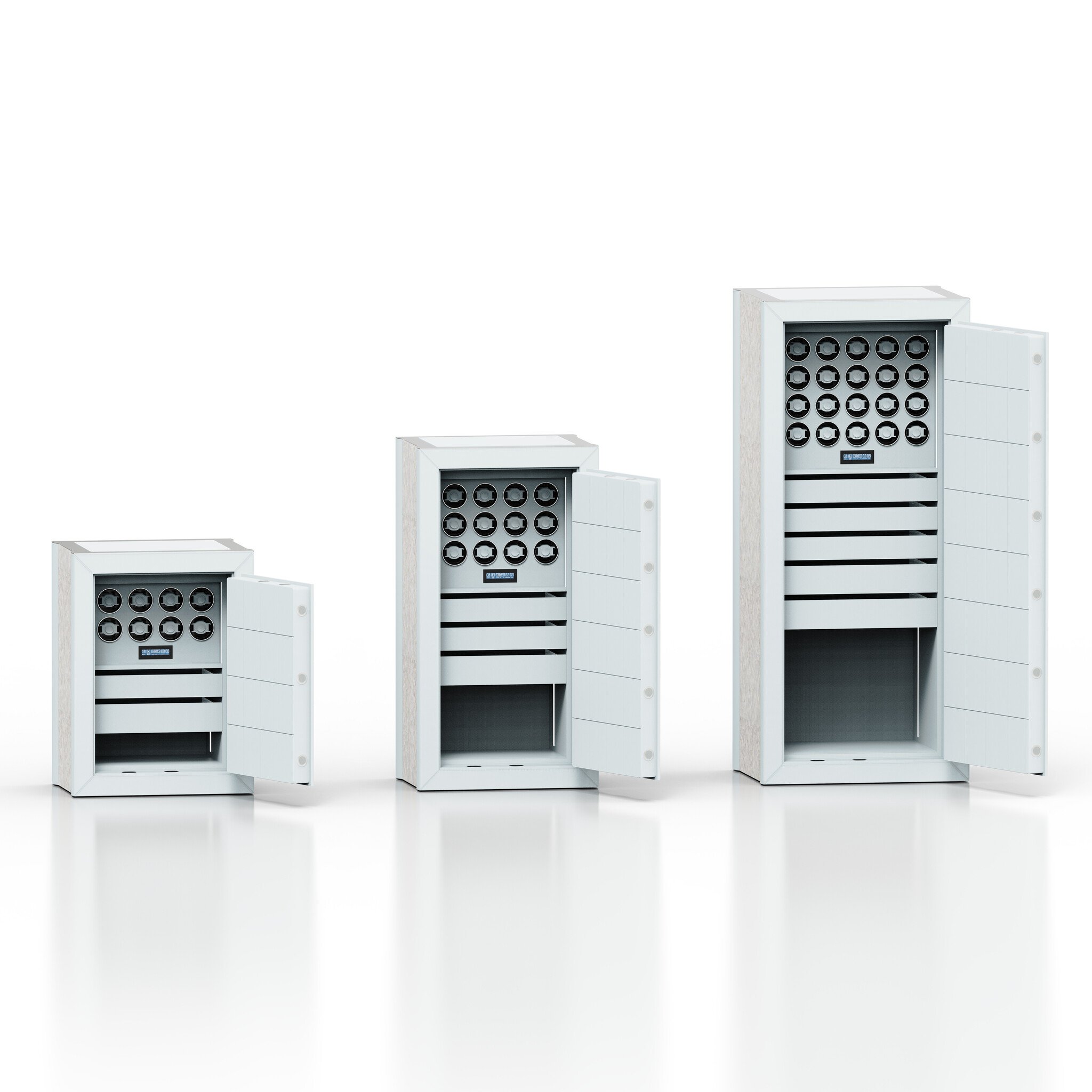Hochwertiges Mikrofaser-Veloursleder-Innenfutter. – Geräuschlose, selbstschließende Schubladen. – Stromversorgung über ein externes Netzteil,mit einer separaten Stromversorgung für das Schließsystem.
