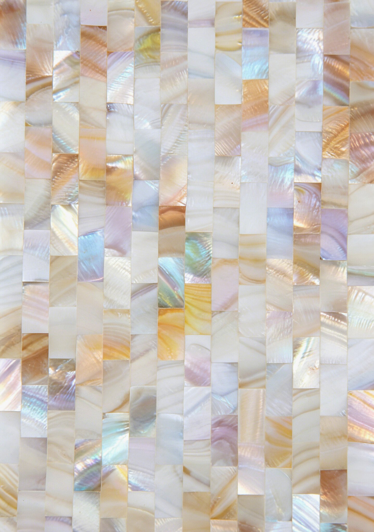 aus authentischen, aus dem Meer stammenden Muschelstücken zusammengesetzt – angeordnet wie ein Perlenmosaik im Läuferverband. Jedes Fragment wird sorgfältig zusammengefügt und poliert, um die natürliche Maserung und den Glanz zu erhalten. Die Oberfläche offenbart wechselnde Farbschichten, wenn Licht darauf fällt – mal wie sanftes Wellenspiel, mal wie das weiche Leuchten von Perlen. Organische Textur trifft auf raffinierte Handwerkskunst.