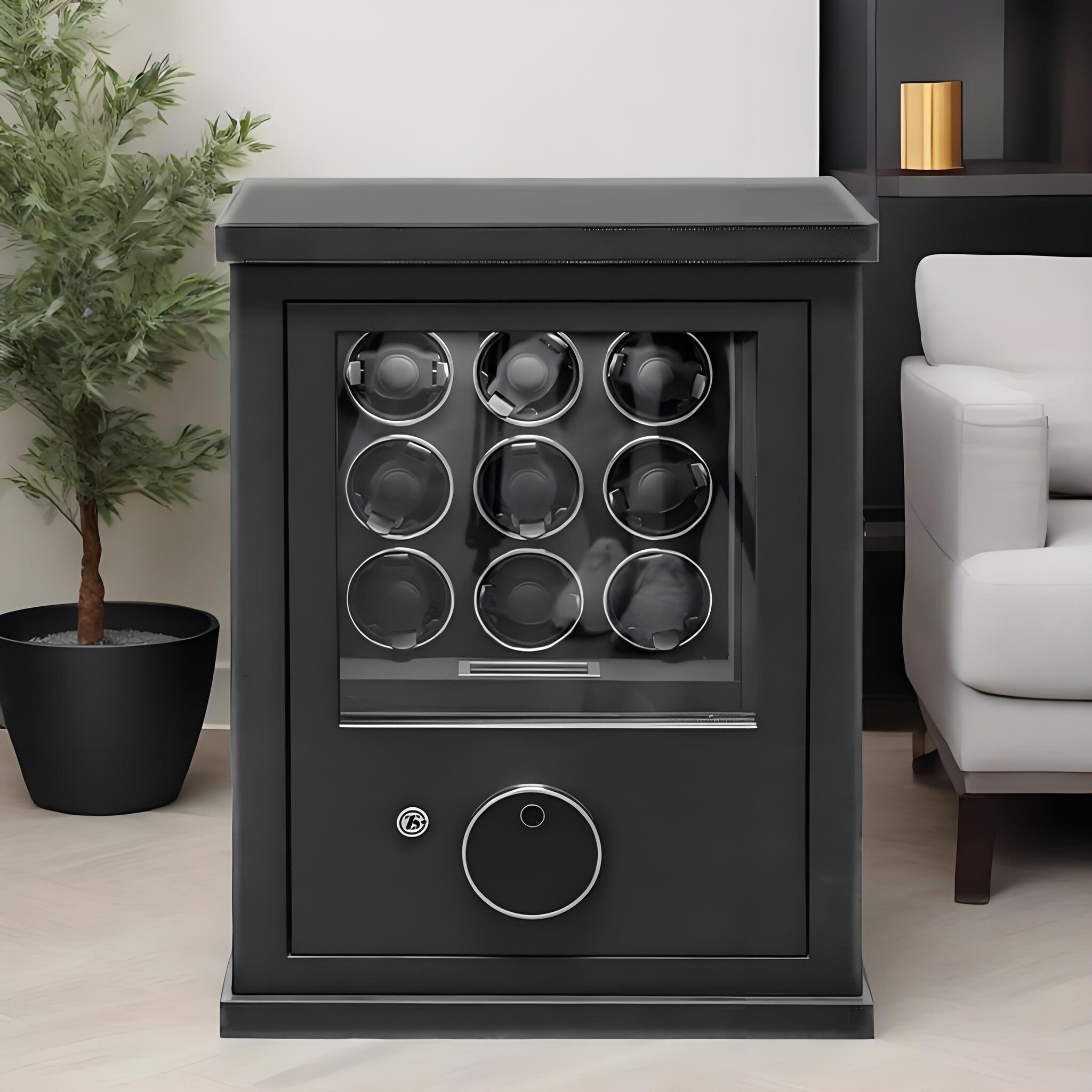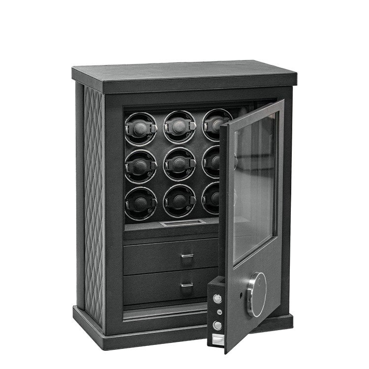 Dieser Safe wurde entwickelt, um Ihre kostbare Sammlung von Uhren und Schmuck unterzubringen, und bietet eine beeindruckende Auswahl an Aufbewahrungsmöglichkeiten. Ausgestattet mit 9 Uhrenbewegern sind Ihre Zeitmesser immer tadellos aufgezogen und bereit zum Tragen. Eine einzige Schmuckschublade bietet spezielle Fächer für Ihre exquisiten Stücke, um sicherzustellen, dass sie organisiert und geschützt bleiben.