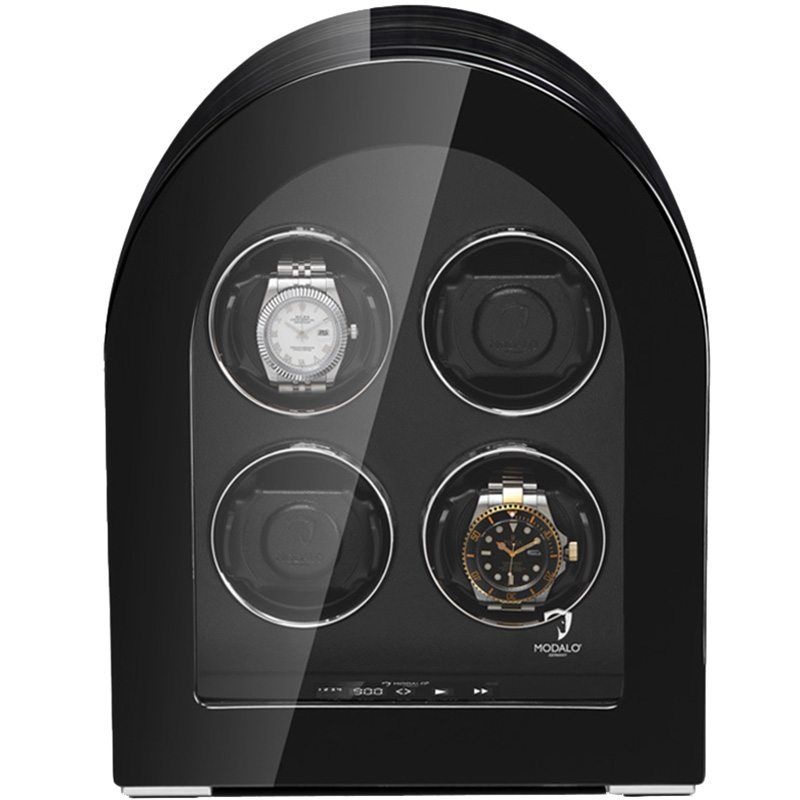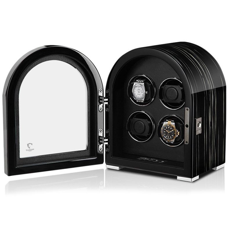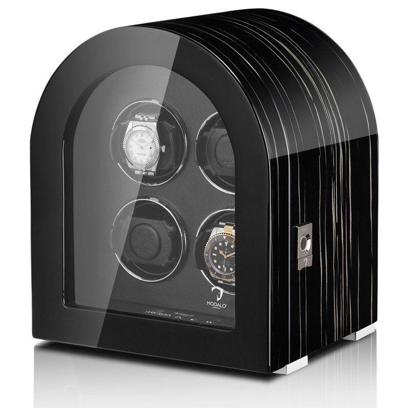 Mit seinem markanten Rundbogen im eleganten schwarzen Makassar-Design und der Integration neuester Technologien bietet diese Kollektion eine spektakuläre Bühne für die Aufbewahrung und Präsentation besonderer Uhren.