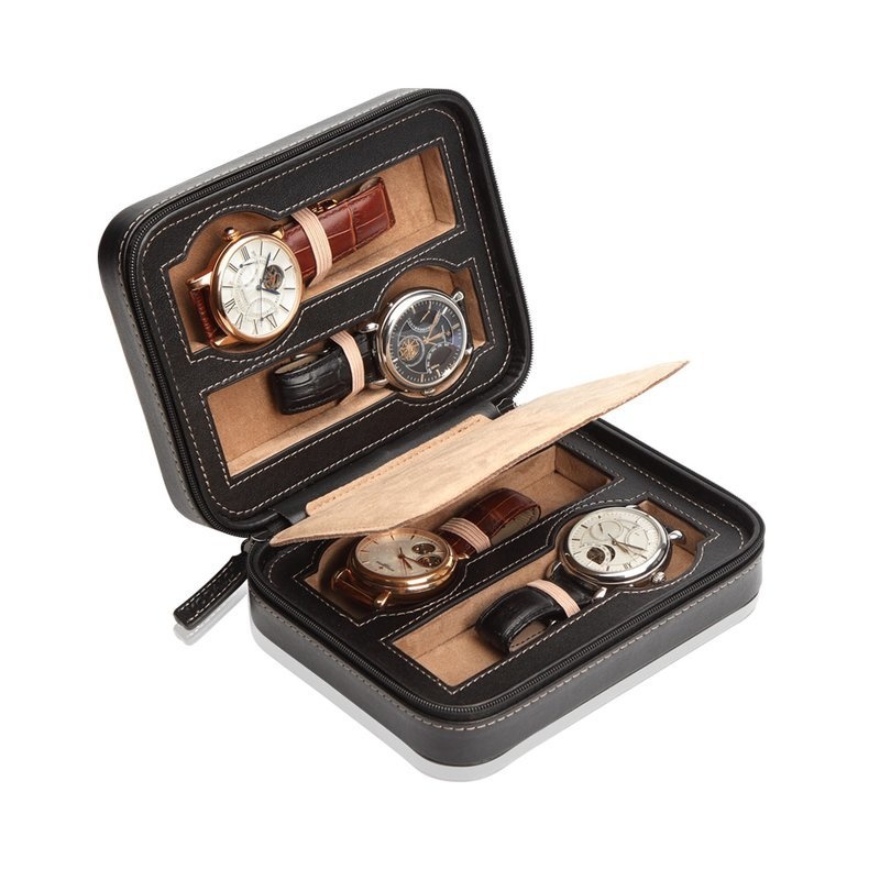 Mit der neuen INVIA Kollektion gehen Ihre Uhren kultiviert auf Reisen. Dank der exquisiten Verarbeitung mit gesteppter Ziernaht, dem weich gepolsterten Mikrofaserfutter und dem umlaufenden Reißverschluss sind Ihre Uhren optimal geschützt. Die Kollektion umfasst insgesamt fünf Größen (für eine, zwei, vier, sechs und acht Uhren), in vier erlesenen Farben.