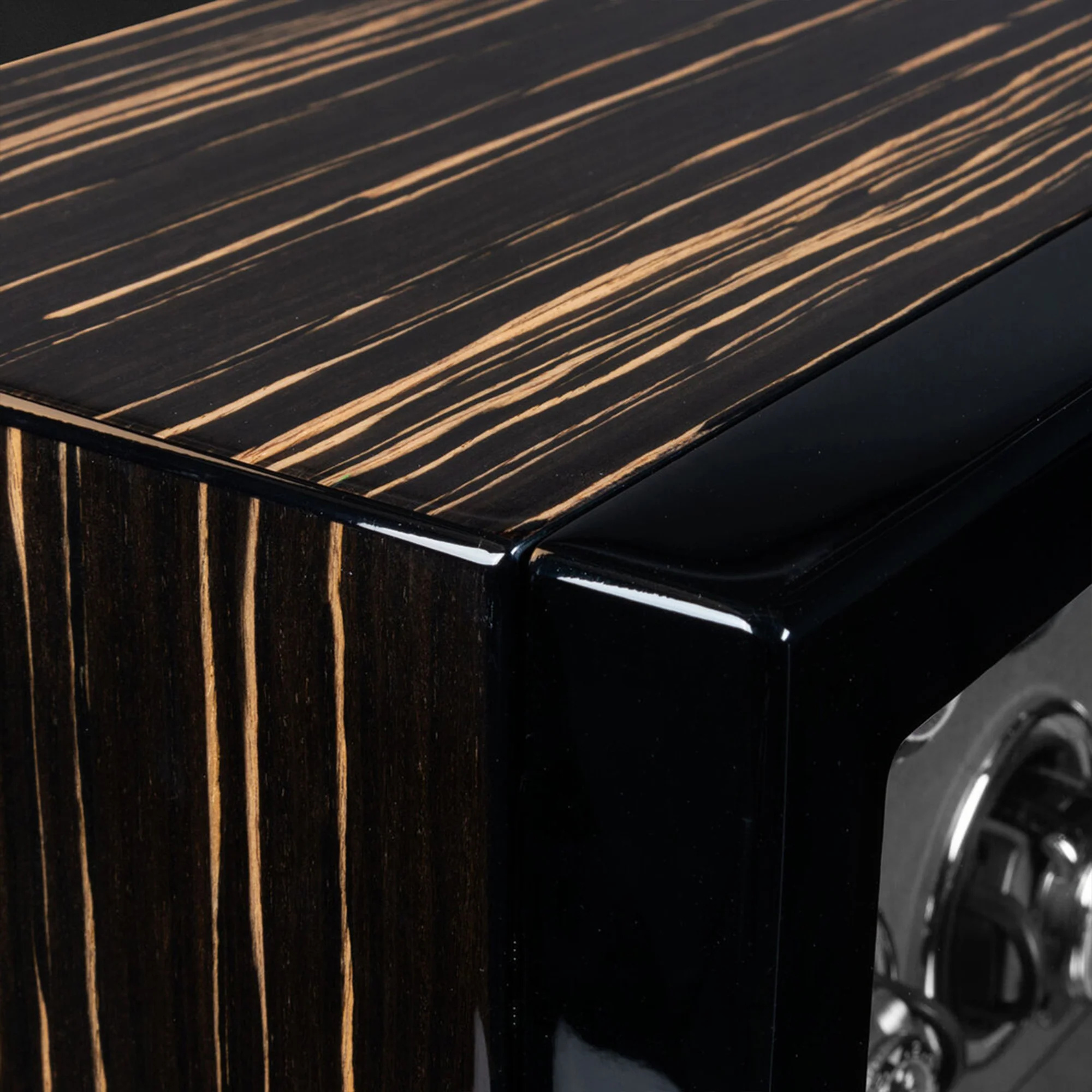 Jede Oberfläche wird aus seltenem, auf Sulawesi angebautem Makassar-Ebenholz handverlesen und aus den architektonischen Furnieren von Alpi® S.p.A., Italien, gefertigt. Veredelt mit fünf Schichten klavierschwarzem Lack und zwischen den Schichten von Hand poliert, ist das Ergebnis eine Tiefe und ein Glanz, die es mit Flügeln aufnehmen können. Akzentuiert mit goldenem Wurzelnussbaum erzeugt dies einen Effekt von Wärme, Textur und zeitloser Vornehmheit.