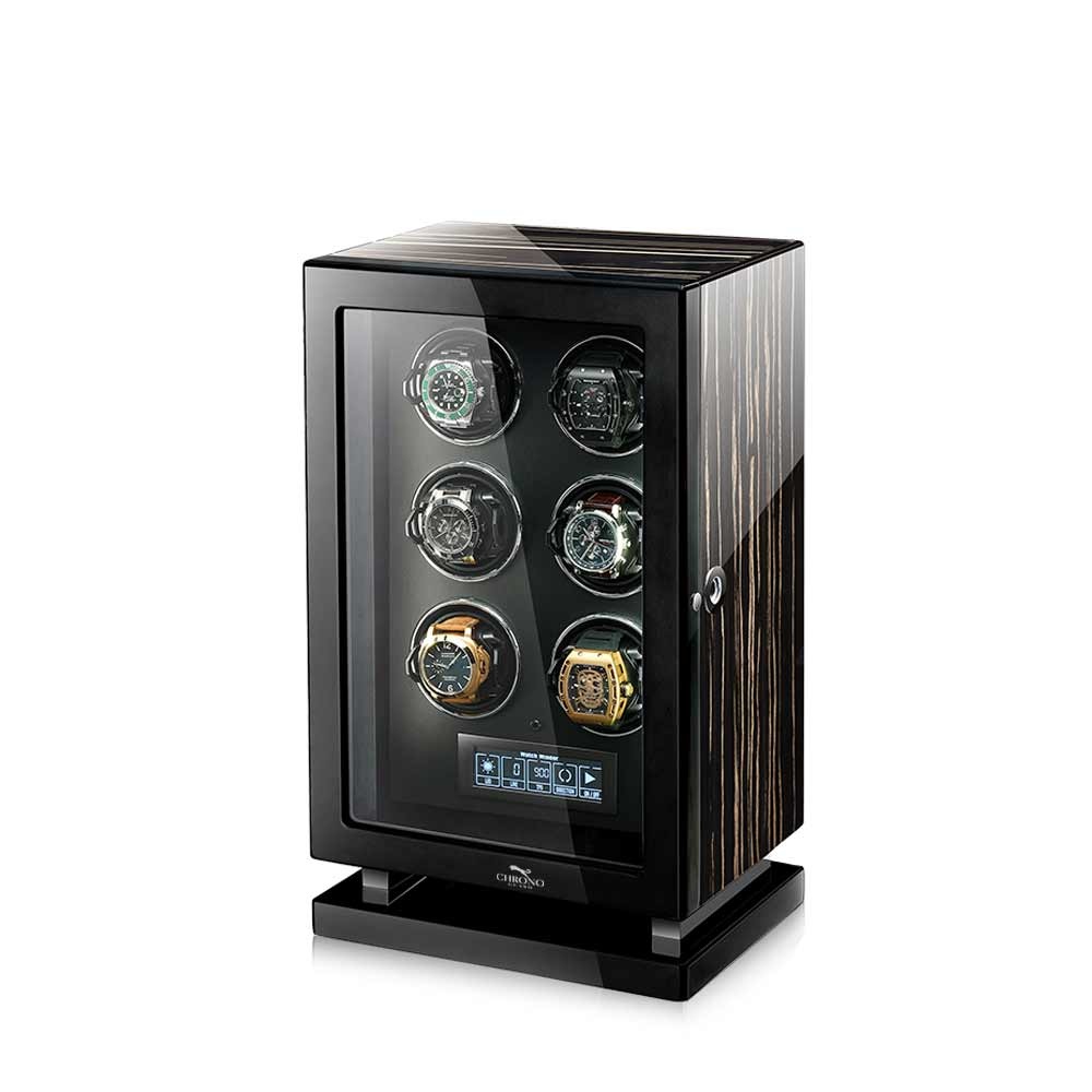 Materialien wie mehrschichtig lackiertes Holz und hochwertiger Edelstahl verleihen dem Uhrenbeweger der Panthera Serie einen ganz besonderen Charme. Die LED Innenbeleuchtung der Uhrenbeweger gewährleistet ein perfektesPräsentationsbild der Automatikuhren zu jeder Tageszeit. Die exklusive LCD Technologie gewährleistet eine einfache Programmierung. Je nach Variante finden 2 - 24 Uhren in diesen Uhrenbeweger den angemessenen Aufbewahrungsort.