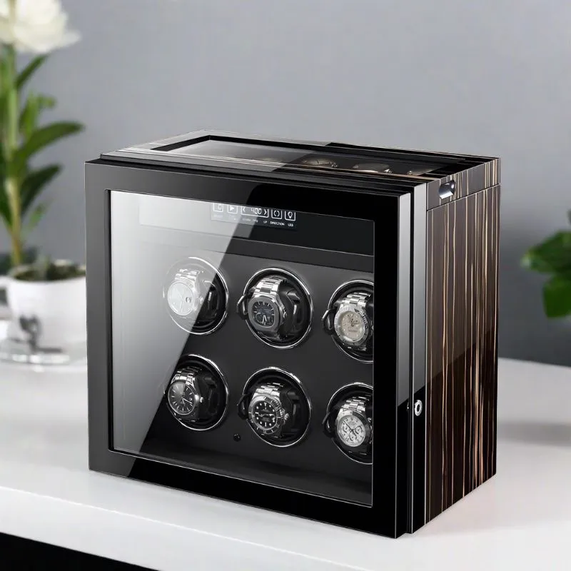Wir stellen das ultimative Uhrenzubehör für Uhrenliebhaber vor - den Premium 6 Uhrenbeweger mit Stauraum aus Zebrano-Ebenholz von Chronoguard. Dieser raffinierte Uhrenbeweger ist aus hochwertigen Materialien gefertigt und bietet einen sicheren Stauraum für Ihre wertvollen Automatikuhren und hält sie gleichzeitig perfekt aufgezogen. Ausgestattet mit leistungsstarken deutschen Motoren sorgt dieses luxuriöse Stück dafür, dass Ihre Automatikuhren jederzeit reibungslos und präzise laufen und immer bereit sind, wenn Sie sie brauchen. Diese atemberaubende Kreation ist aus Zebrano-Ebenholz gefertigt, das jedem Raum, in dem sie aufgestellt wird, einen Hauch von zeitloser Eleganz verleiht. Mit seinem schlanken Design und der praktischen Funktionalität ist der Premium 6 Uhrenbeweger mit Stauraum von Chronoguard ein Must-have für jeden anspruchsvollen Uhrensammler