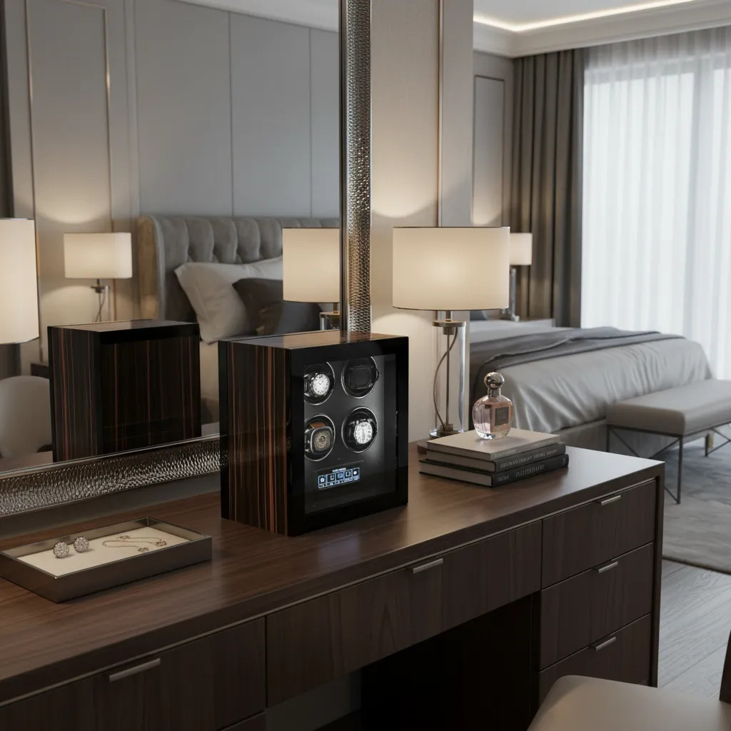 Hochwertiger Luxus Automatik 4 Uhrenbeweger mit Touchscreen. Lackiertes Klavierfurnier in Ebenholzausführung. Einer der feinsten Dual-Uhrenbeweger mit Touchscreen und neuer, nahezu geräuschloser, bürstenloser, langlebiger deutscher Motortechnologie.