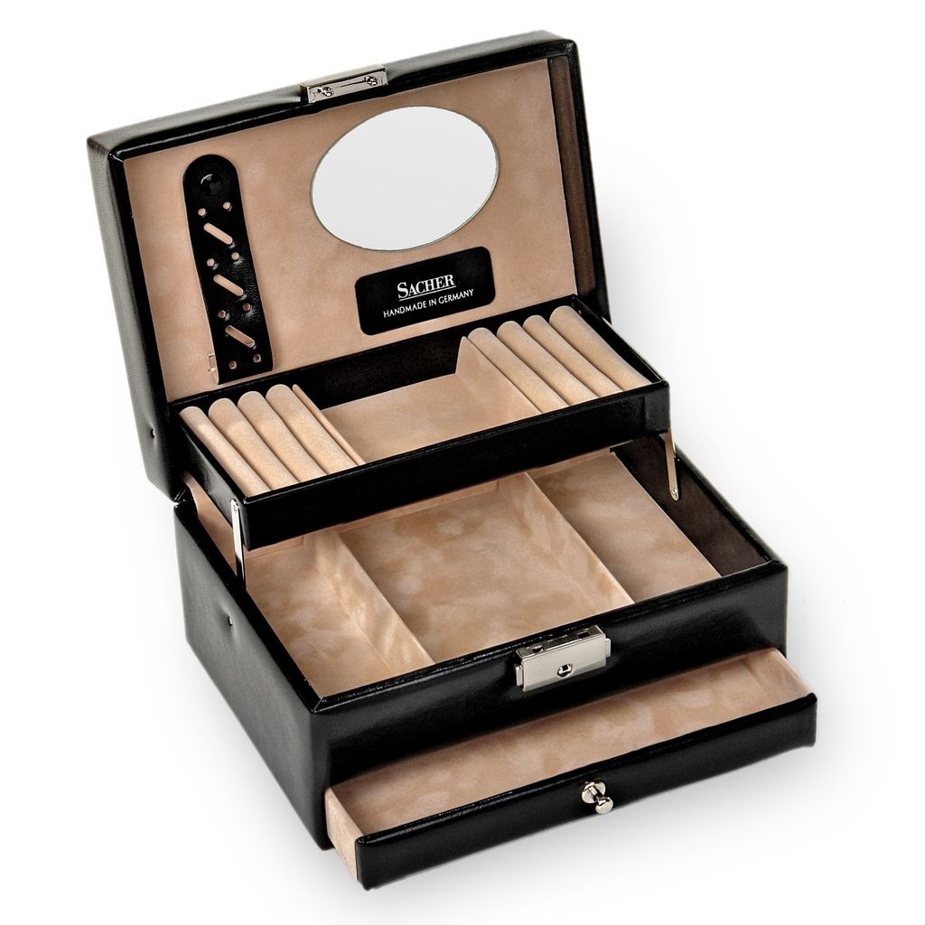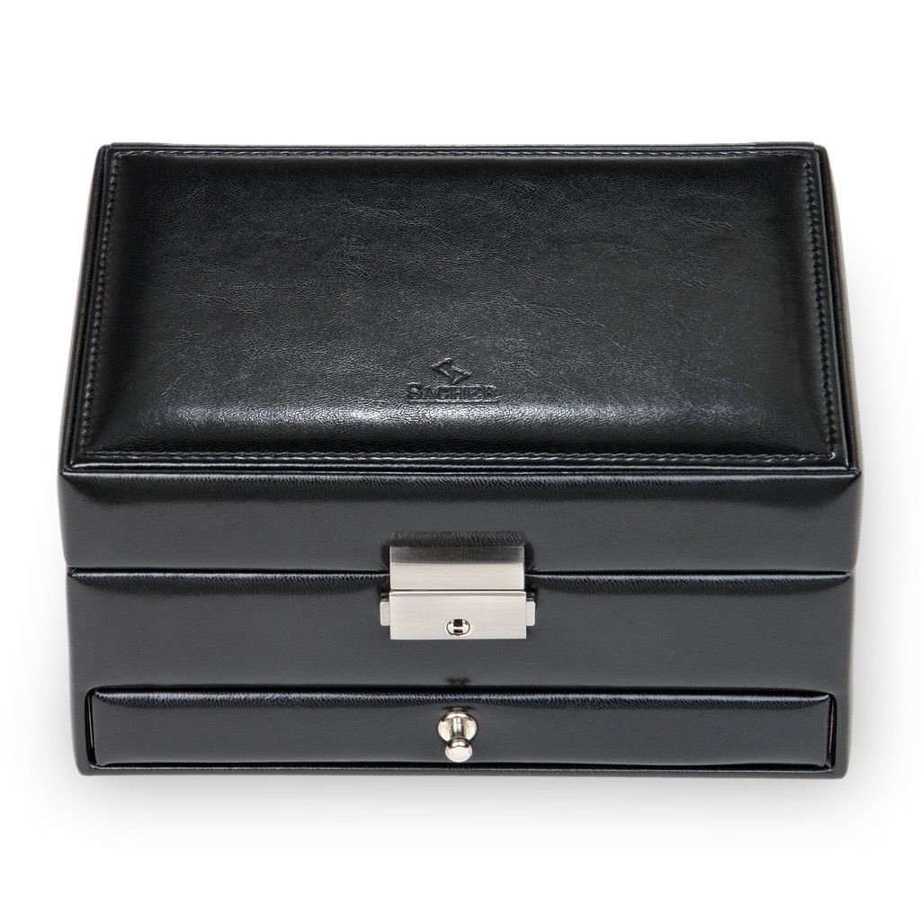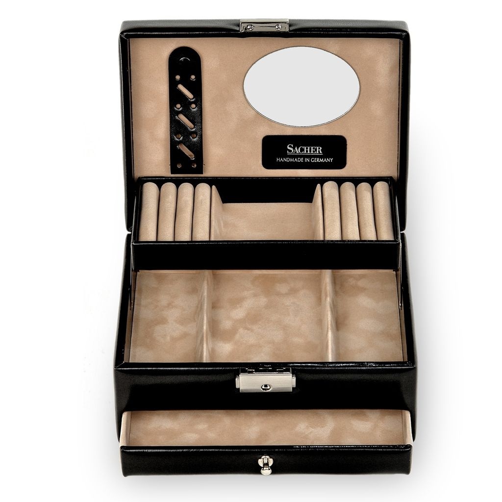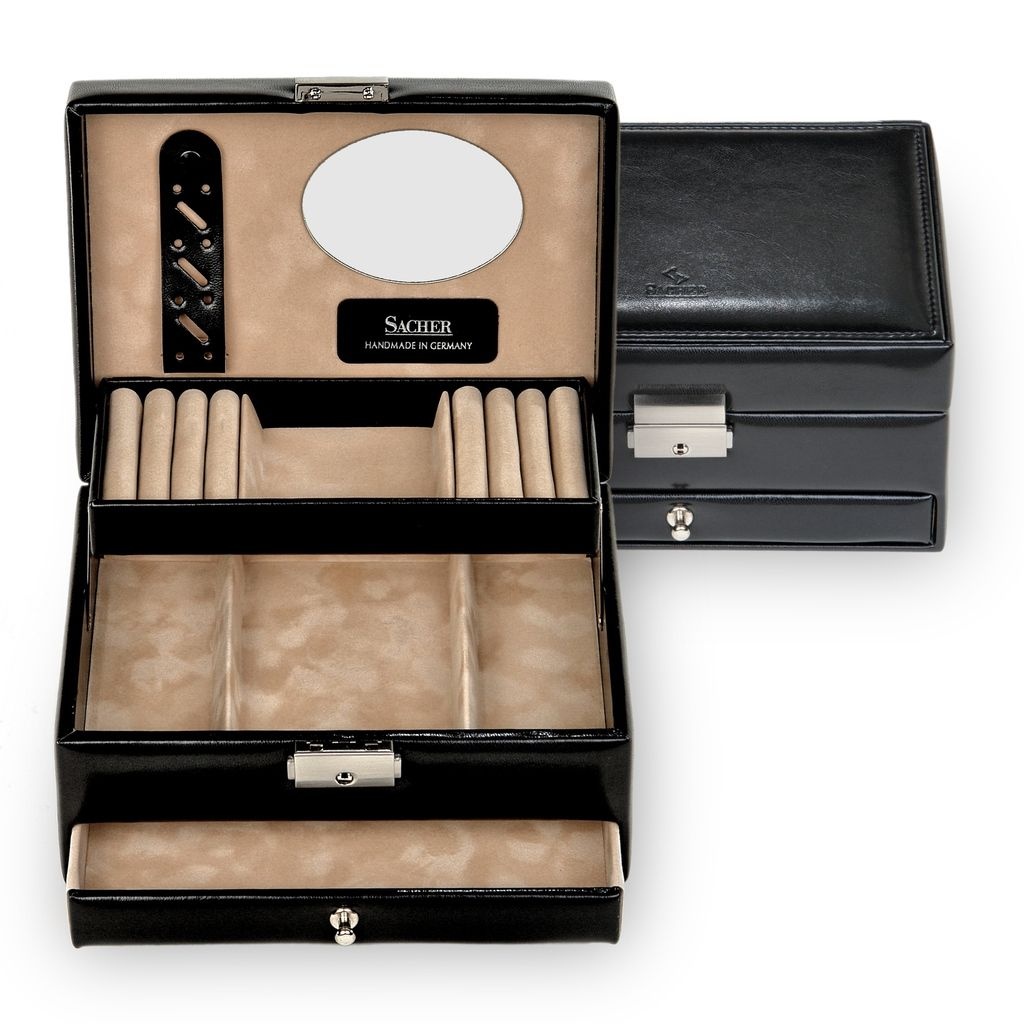 Unser luxuriöser Schmuckkoffer ist die ideale Lösung, um Ihre wertvollen Schmuckstücke sicher und stilvoll aufzubewahren. Dieser exquisit gestaltete Schmuckkoffer vereint Ästhetik und Funktionalität auf perfekte Weise, um Ihre Schmucksammlung zu schützen und gleichzeitig einfachen Zugang zu Ihren Lieblingsstücken zu bieten.- mit 2 Ringpolstern- großer Schublade- abschließbares Schloss- Schmuckband im Deckel- Automatikfach (selbsthebend)- 3 unterteilten Fächern- Spiegel im Deckel- 100% handmade in Germany