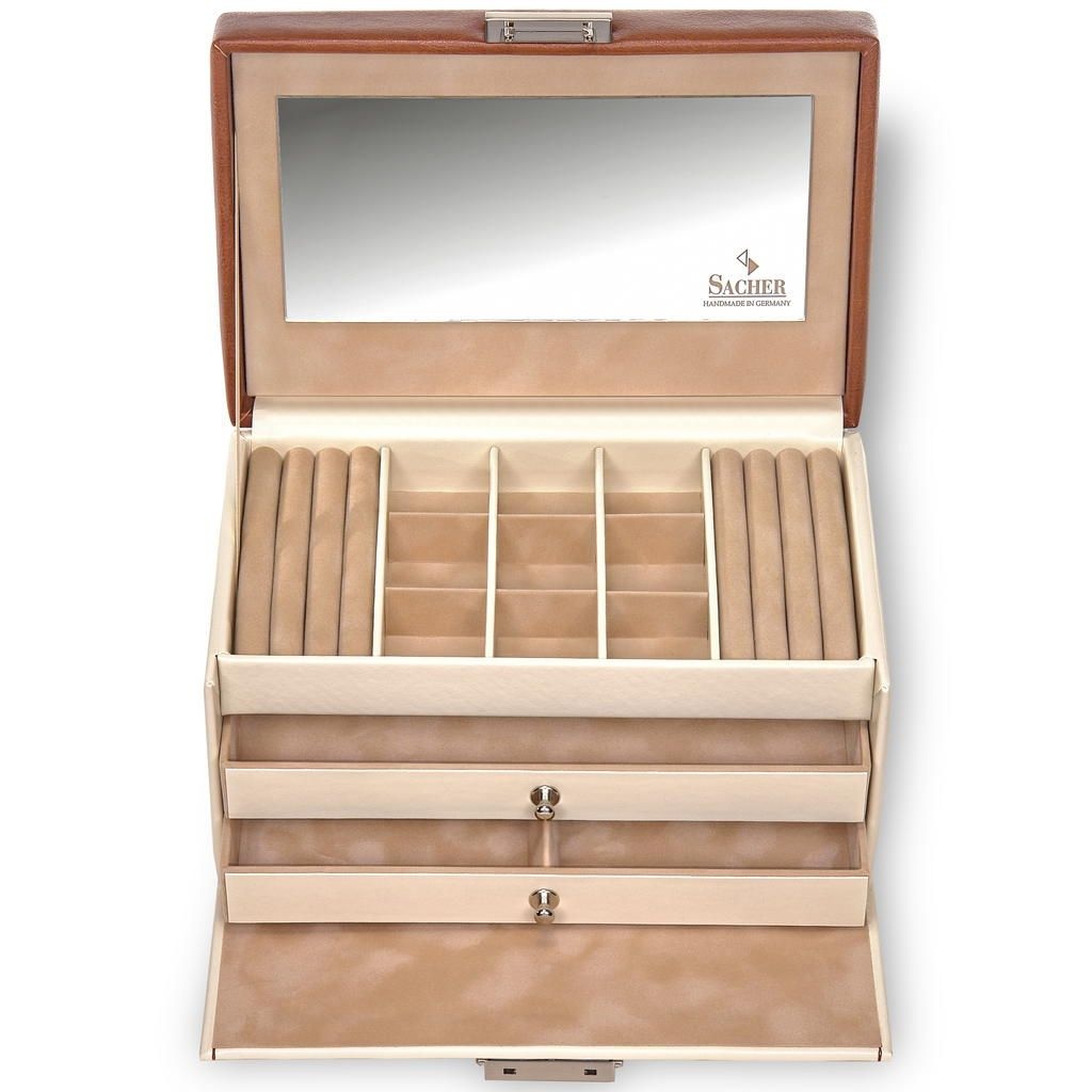 Unser luxuriöser Schmuckkoffer ist die ideale Lösung, um Ihre wertvollen Schmuckstücke sicher und stilvoll aufzubewahren. Dieser exquisit gestaltete Schmuckkoffer vereint Ästhetik und Funktionalität auf perfekte Weise, um Ihre Schmucksammlung zu schützen und gleichzeitig einfachen Zugang zu Ihren Lieblingsstücken zu bieten.- mit 2 Ringpolstern- 2 geräumige Schubfächer, davon 1 unterteilt- 9 kleine Fächer (ca. 35 x 35 mm)- abschließbares Schloss- großer Spiegel- mit elegantem, robustem Tragegriff- 100% handmade in Germany