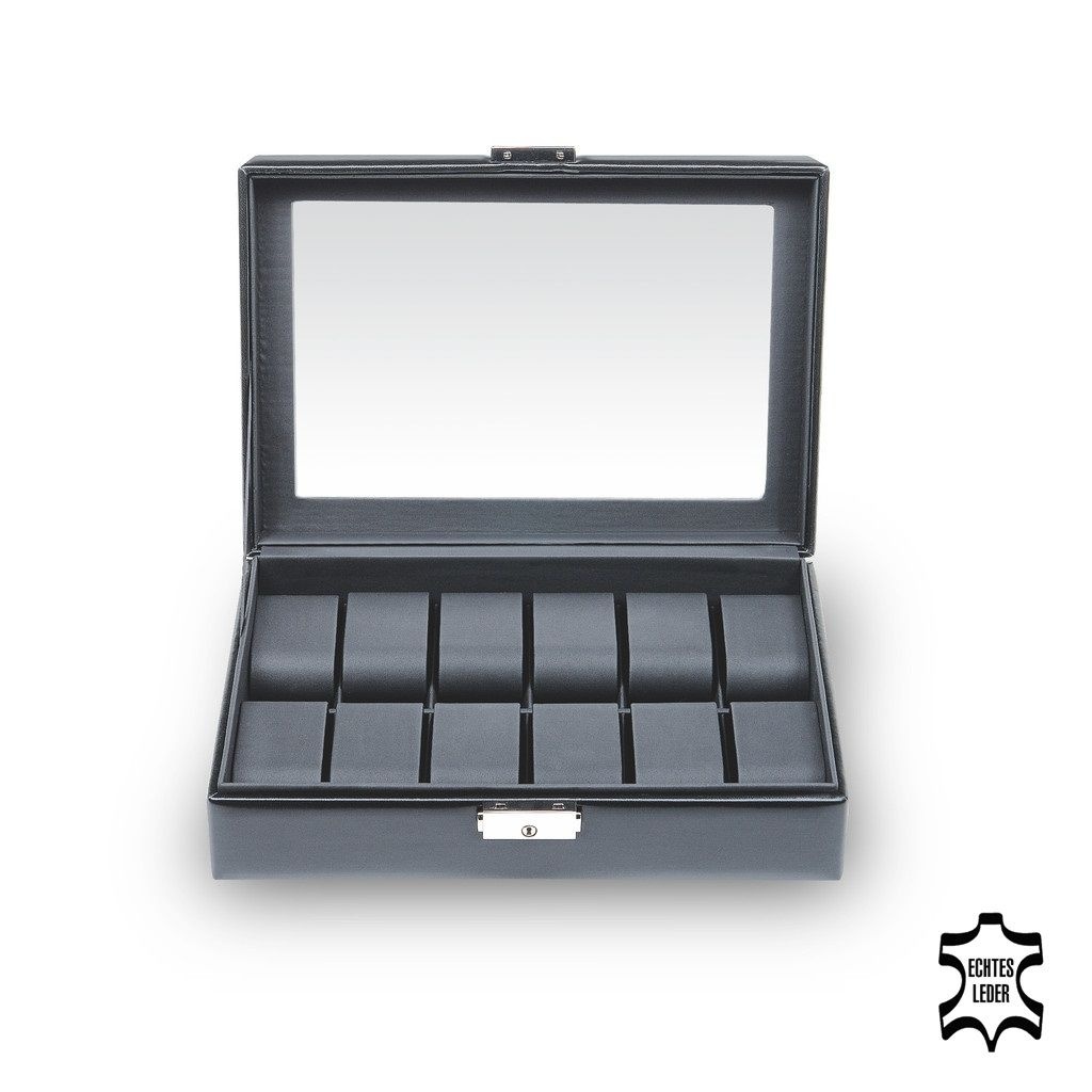 Uhrenbox zur übersichtlichen Aufbewahrung von Uhren. Feine Handarbeit, qualitativ hochwertig gefertigt und äußerst langlebig.- für 12 Uhren- 12 hochwertige, federnde Uhrenspangen- mit Klarsichtfenster- abschließbares Schloss- 100% handmade in Germany