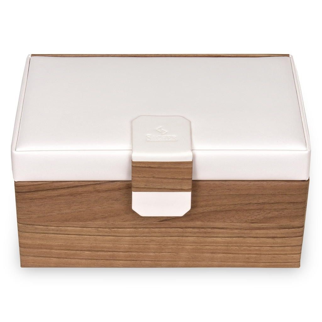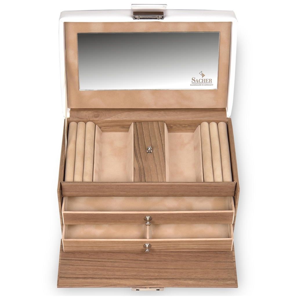 Unser luxuriöser Schmuckkoffer ist die ideale Lösung, um Ihre wertvollen Schmuckstücke sicher und stilvoll aufzubewahren. Dieser exquisit gestaltete Schmuckkoffer vereint Ästhetik und Funktionalität auf perfekte Weise, um Ihre Schmucksammlung zu schützen und gleichzeitig einfachen Zugang zu Ihren Lieblingsstücken zu bieten.- mit 2 Ringpolstern- 2 geräumige Schubfächer, davon 1 unterteilt- Fach mit separatem abnehmbaren Deckelchen- abschließbares Schloss- Spiegel im Deckel- 100% handmade in Germany