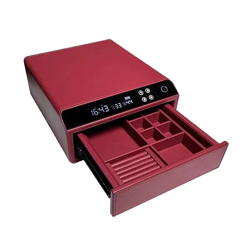 Dieser luxuriöse Ledersafe bietet anpassbare Lagerung mit bis zu vier Schichten und abgetrennten Boxen. Er verfügt über eine Steuerungsoberfläche aus gehärtetem Glas mit intelligenter Touch-Entsperrung und mehreren Entriegelungsmöglichkeiten: digitales Passwort, Maschinenschlüssel und Fingerabdruck. Das Ein-Tasten-Auto-Pop-up-Design verzichtet auf Griffe und bewahrt so ein elegantes Aussehen, während doppelte Notfalloptionen (mechanischer Schlüssel und Typ-C-Wiederauflader-Backup) für zusätzliche Sicherheit sorgen.